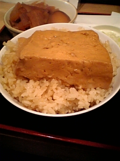 おでんのタネとして煮込まれた豆腐を茶飯の上にのせて、さらにその上からおでん出汁をかけたものです